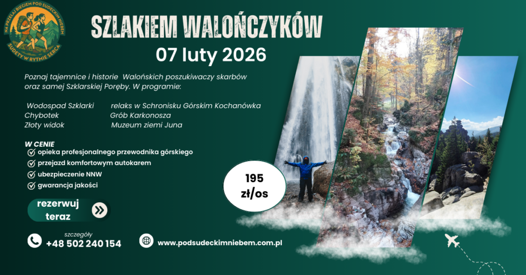 Szklarska Poręba – tam przewidujemy czas wolny na zdjęcia, kawę w Schronisku Górskim Kochanówka oraz zakup pamiątek. Po pierwszej atrakcji udamy się na formację skalną Chybotek i przekonamy się skąd taka nazwa!. Ale, być w takim miejsu i nie odwiedzić legendarnego Ducha Gór? To niemożliwe – Grób Karkonosza- staniemy oko w oko z legendą Gospodarza Karkonoszy. Następnie udamy się na platformę widokową Złoty Widok – sami Państwo zdecydują czy widok rzeczywiście złotym nazwać można. I na końcu – Walońska historia, atmosfera skarbów, tajemnice ich fachu i skarby w całej okazałości – czyli Muzeum Ziemi Juna – przeniesie Nas w XII wiek i czasy Walończyków.